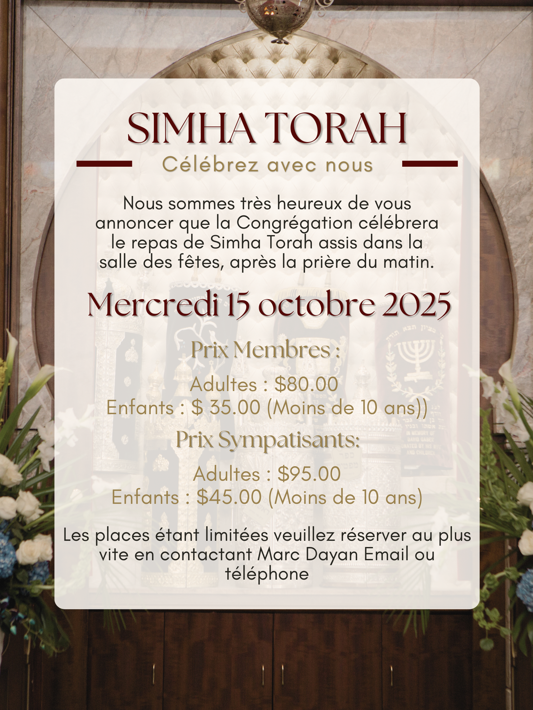 Nous sommes très heureux de vous annoncer que la Congrégation célébrera le repas de Simha Torah assis dans la salle […]