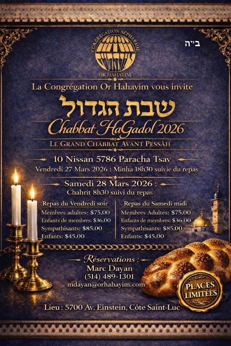 Comme tous les ans, la Congrégation Or Hahayim organise les repas de Chabbat Hagadol, afin de vous soulager, surtout les dames, des préparatifs de Pessah. Vous pourriez réserver les deux repas de Chabbat, ou l’un d’eux. Les réservations sont à présent ouvertes. Les places étant limitées, premier venu, premier servi.