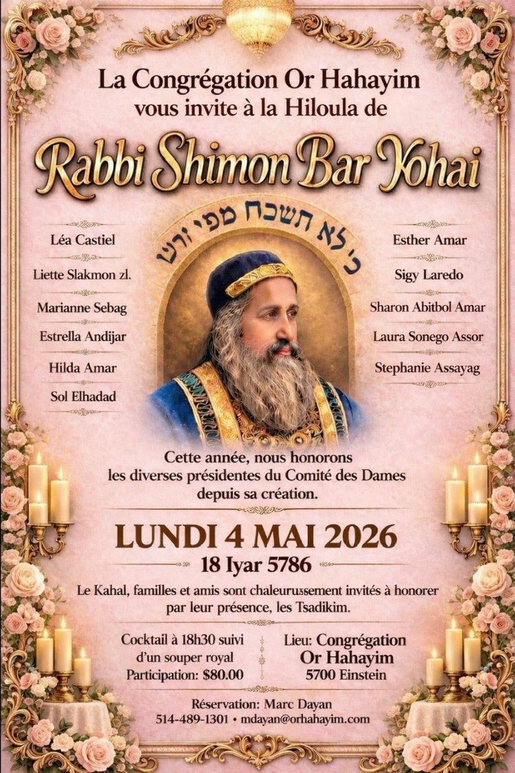 Comme tous les ans, la Congrégation Or Hahayim organise  la Hiloula de Rabbi Shimon Bar Yohaï.  Cette année nous honorons  les diverses présidentes du Comité des Dames depuis sa création.  Nous comptons sur votre présence pour faire de cette soirée un succès.